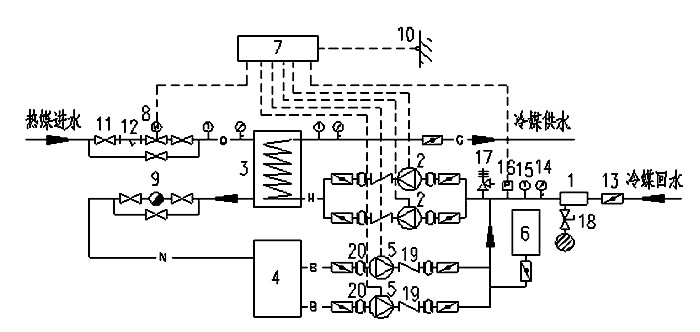1、反沖排污過濾器2、循環(huán)泵3、換熱器4、補水箱5、補水泵6、穩(wěn)壓罐
